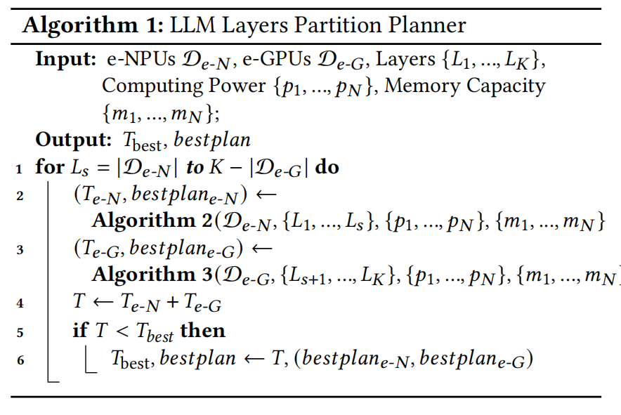 在HybridOP流水线中,e-NPUs和e-GPUs分别放置在流水线头部和尾部。为了搜索最优层分区方案,作者分别搜索e-NPUs和e-GPUs的层分区,以降低搜索复杂度。作者首先迭代搜索层分区$s$,其中${L_1, .., L_s}$层和${L_{s+1}, .., L_l}$层分别在e-NPUs和e-GPUs上分区。为降低搜索复杂度,作者设计了异构感知搜索算法,包括两个高效的动态规划(DP)算法,分别用于最小化$T_{zo}$和$T_{fo}$,如算法1所述。
