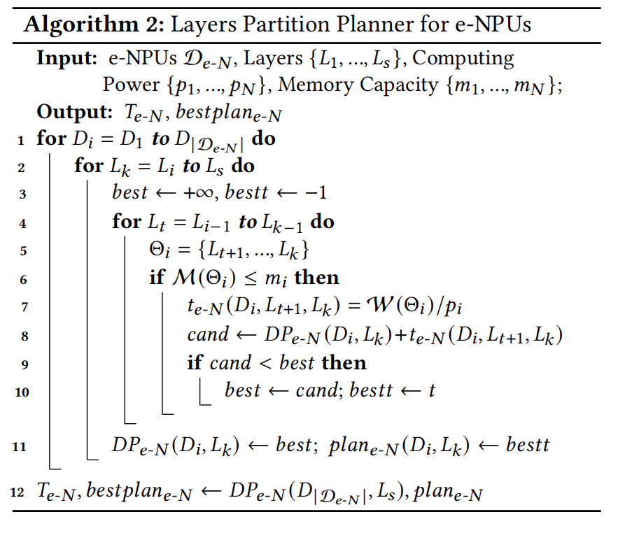 最小化$T_{e-N}$。直观上,前$k$层的最小执行时间由前$k-1$层决定,这意味着最优解可以从子问题的最优结果构建,这促使作者使用动态规划来解决最优分区。因此,作者设计了一个层分区DP算法,搜索e-NPU设备的最优层分区${[l_i, r_i]}{i \in D{e-N}}$。设$DP_{e-N}(D_i, L_k)$表示e-NPU设备${D_1, .., D_i}$覆盖前$k$层${L_1, …, L_k}$所使用的最小总执行时间。状态转移方程表述为: