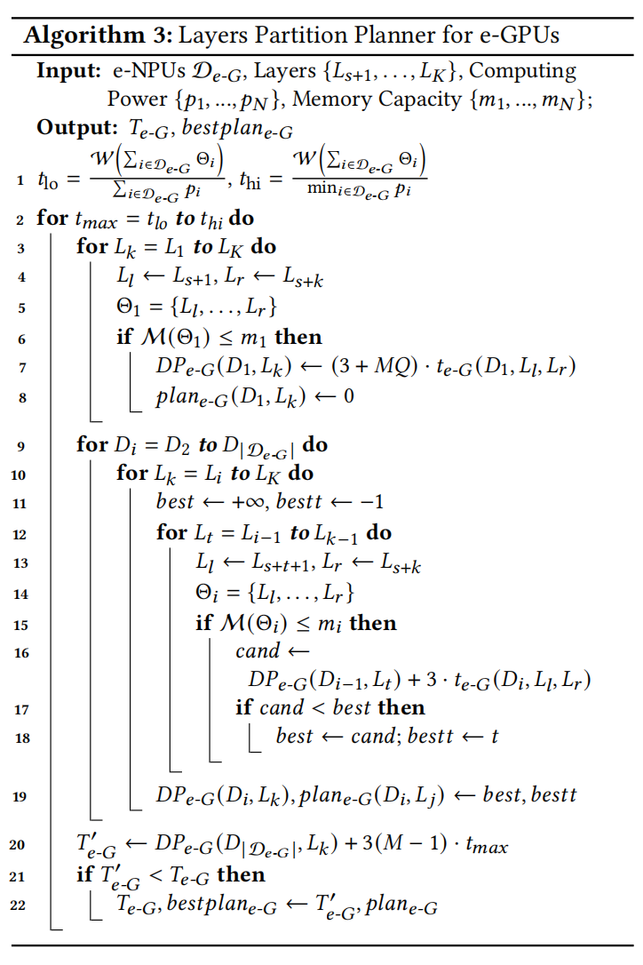 其中$t_{e-G}(D_i, L_{s+t+1}, L_{s+k}) = \frac{W(\Theta_i)}{p_i}$表示在第$i$个e-GPU设备上对由这些层${L_{s+t+1}, …, L_{s+k}}$组成的模型$\Theta_i$执行前向传播所需的时间,$t \in [\max{s+1, i-1}, k-1]$。公式(9)显示,当$\max$项固定时,$DP_{e-G}(D_i, L_k)$通过遍历所有可能层来确定,并选择最小化前$k$层执行延迟的那个。当$i = |D_{e-G}|$和$k = K$时,作者获得最优值$DP_{e-G}(D_{|D_{e-G}|}, L_K)$和固定$t_{max}$对应的最优层分区。随后,通过比较不同$t_{max}$下的$DP_{e-G}(c, s) + 3(N-1)t_{max}$,作者确定最优分区计划。