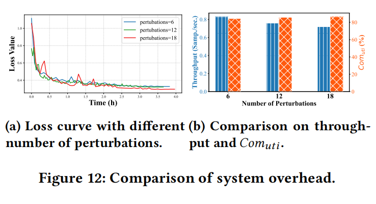 在本节中,作者研究了不同扰动数量对收敛性能和流水线效率的影响,如图12所示。随着扰动数量的增加,收敛损失减少,作者观察到将扰动数量设置为12时,收敛时间最短。这是因为增加扰动数量延长了每次迭代的时间,降低了整体吞吐量,从而延长了总收敛时间。此外,作者观察到,尽管扰动计数增加,HybridOP的计算利用率几乎保持不变。这是因为设计的提前退出微调模块有效地确保了流水线中空闲的e-NPUs得到充分利用。作者进一步分析了该模块的有效性。