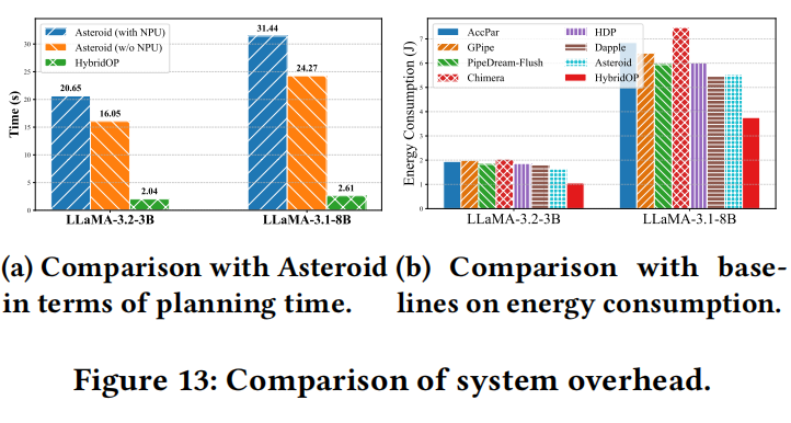 规划器开销。为了最小化单次迭代内的执行延迟,作者为HybridOP流水线新设计了LLM分区规划器,以确定异构设备的最优层分区计划。在这里,作者评估执行LLM分区规划器的时间开销。如图13a所示,Jetson Orin NX设备需要2.04秒来确定具有28个transformer块的LLaMA-3.2-3B模型的最优分区,对于具有32个transformer块的LLaMA-3.1-8B模型需要2.61秒。与Asteroid相比,搜索最优层分区的时间减少了8倍到12倍。与微调LLMs所需的执行延迟相比,HybridOP的规划时间可以忽略不计。