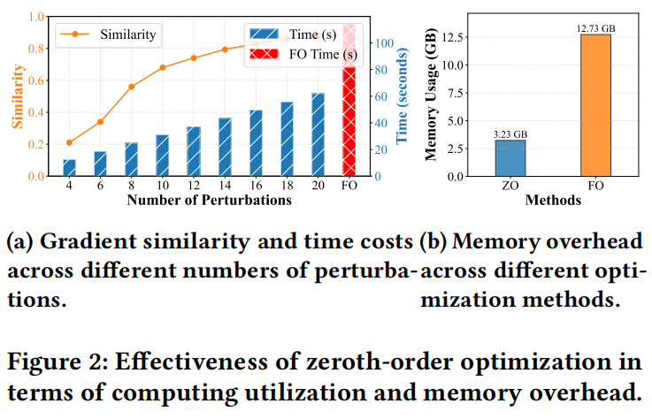 此外,使用零阶优化估计梯度消除了对反向传播和中间激活保存的需求,从而减少了内存消耗,如图2b所示。