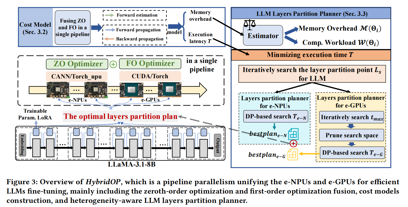 因此,在这项工作中,作者提出了HybridOP,一种新颖的流水线并行方案,能够高效地统一异构e-NPUs和e-GPUs,并充分发挥计算潜力,如图3所示。具体来说,作者构建了专用的成本模型,这些模型表征了针对HybridOP流水线定制的执行延迟和内存开销,并分析了最优设备放置方案。然后,新设计的LLM层分区规划器为异构e-NPUs和e-GPUs采用不同的搜索策略,快速搜索最优层分区计划,从而最小化执行延迟。作者进一步引入基于零阶优化的提前退出微调,以提高计算利用率。