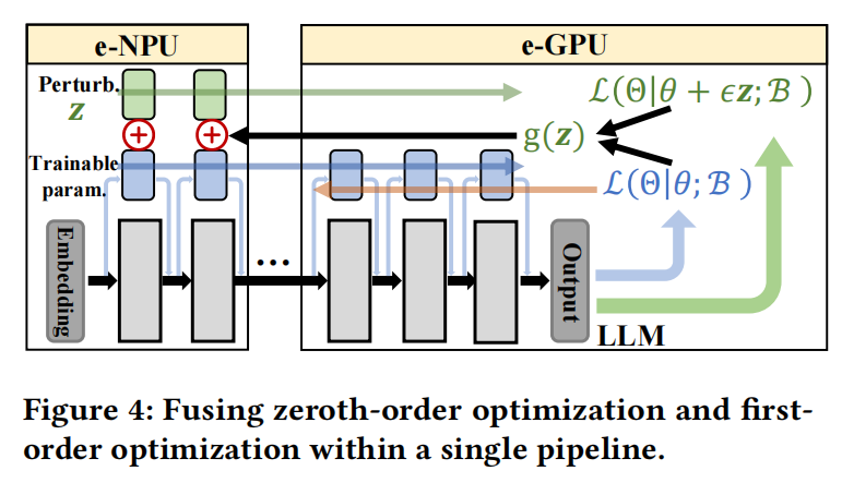 如图5d所示,e-NPU设备和e-GPU设备分别放置在流水线头部和尾部。这些e-NPUs和e-GPUs首先对多个微批次执行前向传播,计算它们相应的无扰动基础损失。随后,e-GPU设备执行反向传播以获取BP梯度,e-NPU设备扰动LLM的可训练参数以获取估计损失,然后计算估计梯度。单次迭代的总时间为: