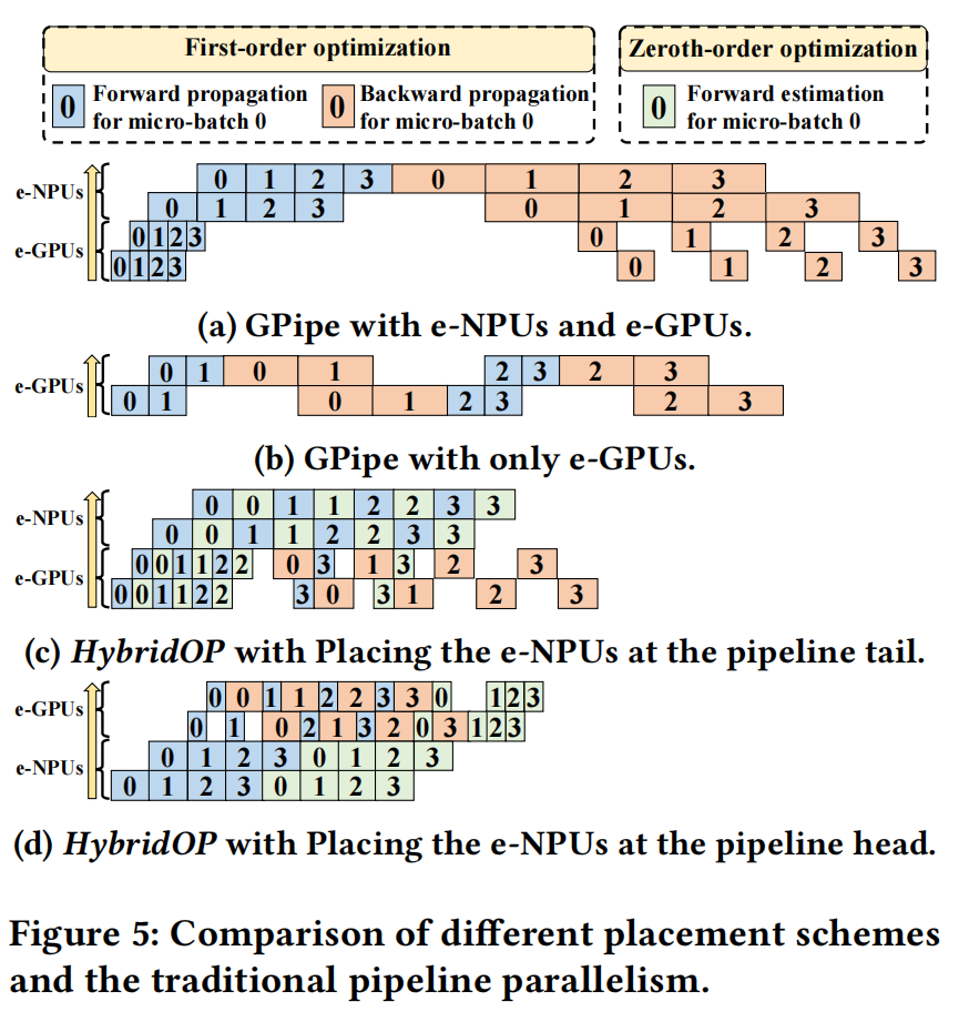 如图5c所示,在HybridOP流水线中,e-NPU设备放置在流水线尾部,e-GPU设备放置在流水线头部。e-GPUs在e-NPUs通过多次前向传播获得估计梯度后计算BP梯度。因此,其在单次迭代中的总时间为: