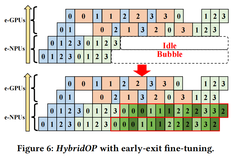 在HybridOP流水线中,e-GPU设备位于流水线尾部,这些设备的前向和反向传播都依赖于零阶设备的前向传播。此外,它们还需要为e-NPU设备执行前向估计并计算估计损失。当设计的LLM分区规划器在异构e-GPUs和e-NPUs上实现相对平衡的计算工作量时,e-NPU设备将经历一些空闲时间,如图6顶部所示。为了充分利用计算能力,作者进一步设计了一种新颖的提前退出微调模式,以增加e-GPUs和e-NPUs上计算的并行性,如图6底部所示。