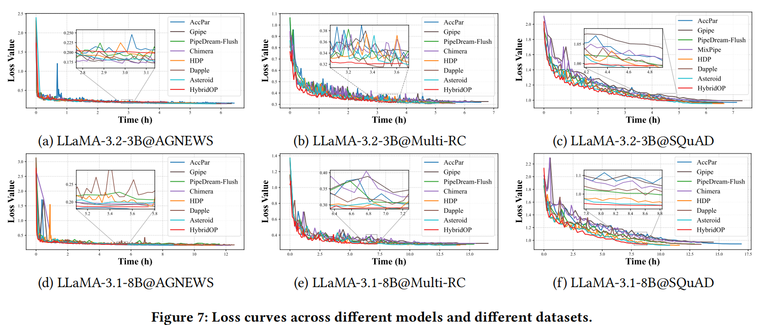 在本节中,作者进行了大量实验,证明HybridOP在保持可比较的收敛性能的同时,显著减少了各种模型和微调任务的收敛时间,如图7、图10和图11所示。图7描绘了在不同实验设置下使用各种并行方法进行微调的损失曲线。图10和图11显示了HybridOP和所有基线的最终收敛性能和收敛时间,说明HybridOP比所有基线实现了更快的收敛。