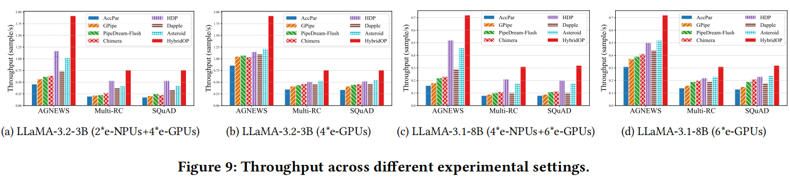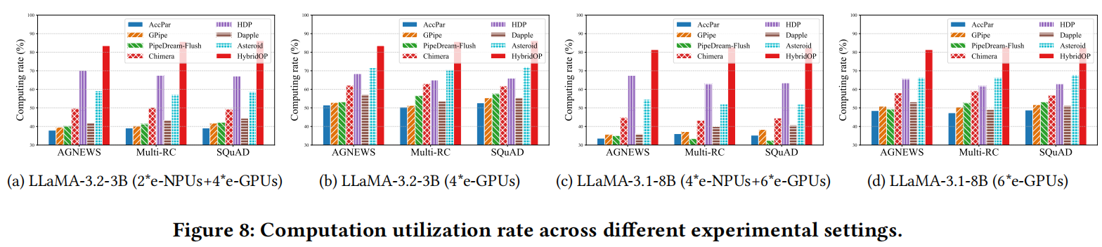 与流水线并行的比较。(1) 在跨不同任务微调LLaMA-3.2-3B和LLaMA-3.1-8B时,与GPipe相比,HybridOP实现了0.8×-3.0×的吞吐量提升和29.0%-44.7%的计算利用率提升。与PipeDream-Flush相比,HybridOP提供了0.6×-2.3×的吞吐量提升和25.7%-46.9%的计算利用率提升。这是因为GPipe和PipeDream-Flush都是为同构集群设计的,导致异构设备的层分区不平衡。(2) Chimera通过引入双向流水线减少气泡率。然而,在不同实验设置下,HybridOP将气泡率降低了18.41%-36.5%,同时将吞吐量提高了2.3倍。这表明HybridOP使e-NPUs和e-GPUs能够分别执行前向估计和反向传播来计算梯度,而无需依赖。(3) 观察到在使用e-NPUs的异构环境中,各种流水线并行和Accpar的平均吞吐量降低了0.43倍,计算利用率降低了13.1%。这是因为这些并行方法无法有效利用e-NPUs上ZO的计算能力,导致这些设备成为整个微调过程的瓶颈。