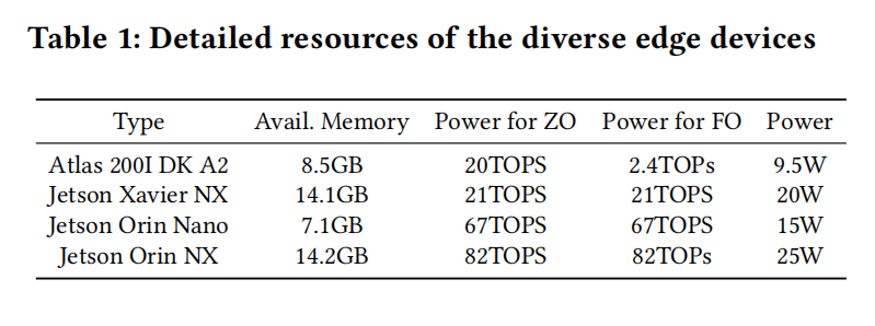 硬件测试平台。作者构建了真实世界的硬件测试平台,包括边缘NPUs:华为Atlas 200I DK A2,以及边缘GPUs:NVIDIA Jetson Orin,Xavier。详细的内存容量、计算能力和功耗模式如表1所示。