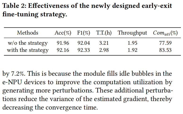 新设计的提前退出微调模块可以在保持高效流水线微调的同时增加扰动数量。因此,作者进行了一系列对比实验,证明该模块在使用AGNEWS数据集微调LLaMA-3.2-3B时的有效性。如表2所示,使用该模块将计算利用率提高了5.94%,将收敛时间减少了7.2%。这是因为该模块通过生成更多扰动来填充e-NPU设备中的空闲气泡,从而提高计算利用率。这些额外的扰动减少了估计梯度的方差,从而减少了收敛时间。