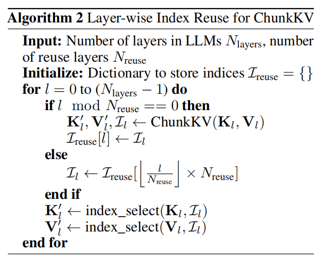 (K'_l, V'_l, I_l) ← ChunkKV(K_l, V_l) # 做完整的 chunk 选择