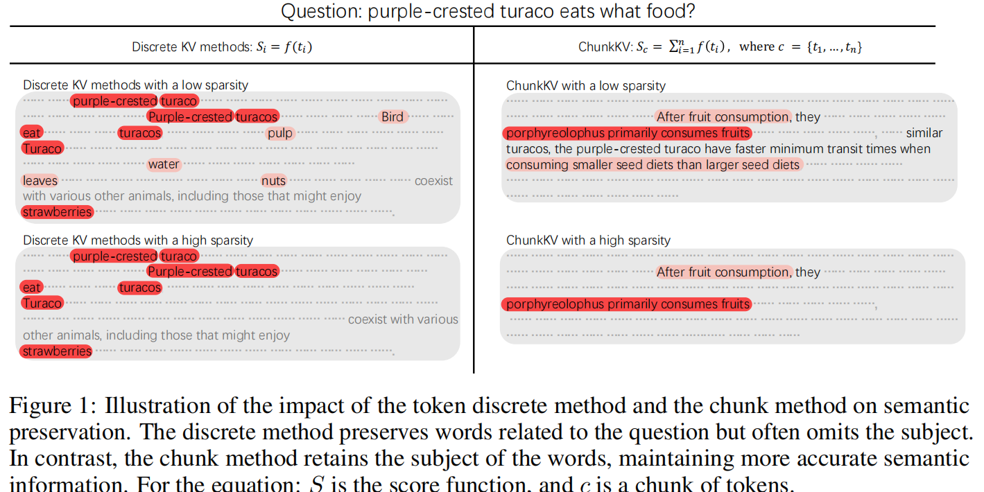 - 核心假设:自然语言中的“完整语义信息”通常由一段连续 token 构成(例如主语 + 谓语 + 宾语或整个短语)。将这些 token 作为整体(chunk)保留或删除,比以 token 为单位做稀疏更能保留语义。