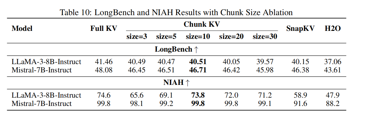 - 当 chunk size 太小(如 1 或 3)时,会把语义片段过度碎片化,导致性能下降(例如 LongBench、NIAH 的结果)。当 chunk size 太大(如 30)时,会丢失细粒度信息,某些任务(需要精确 token 的)出现退化。Table 10 / Table 19/20 显示了完整值。