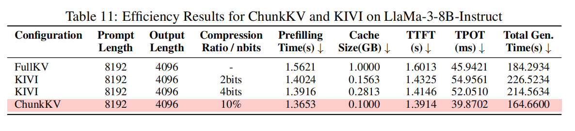 性能/效率实测(示例):在 LLaMA-3-8B-Instruct、prompt 8192 / output 4096 的配置下,ChunkKV(10%)在 Total Gen Time 上 164.66s,而 KIVI-2bits 为 226.52s(ChunkKV 有 ~27.3% 的整体推理速度优势);TTFT、TPOT 等延迟关键指标 ChunkKV 也更优(详见 Table 11)。