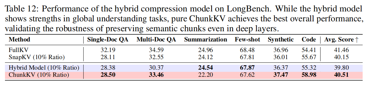 实验:采用 hybrid(下半层用 ChunkKV,上半层用 SnapKV)并与纯 ChunkKV / 纯 SnapKV 比较(同一压缩率)。结果显示: