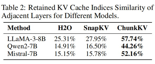 - 观测:ChunkKV 选出的 chunk 索引在相邻层之间具有高相似性(论文用 Jaccard similarity 统计,ChunkKV 在 LLaMA-3-8B 上相邻层平均相似度远高于 SnapKV),因此完全可以在若干连续层间共享索引。