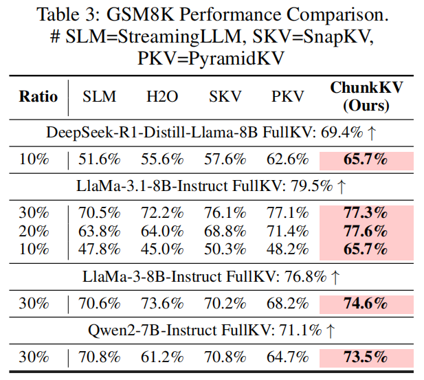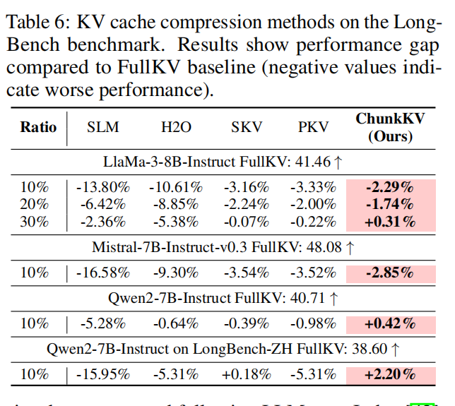 - 整体测评:论文以压缩后性能差距(相对 FullKV)来呈现结果(Table 6)。ChunkKV 在 LLaMA-3-8B、Mistral-7B、Qwen2-7B 的各项子任务上普遍优于或接近最优(在某些 ratio 下甚至小幅超过 FullKV),尤其在 10%~30% 区间效果稳定。