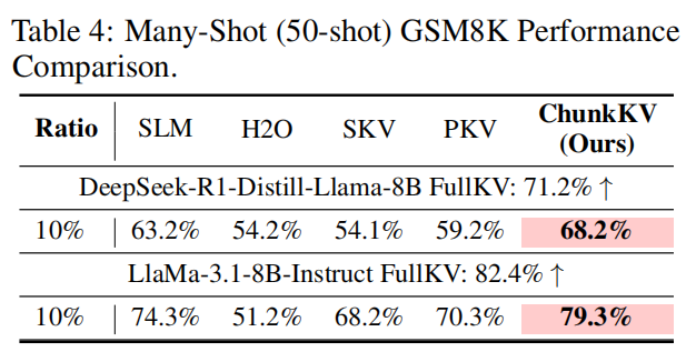 - Many-shot 场景(50-shot)对语义完整性要求更高(示例完整保留对数学推理与 chain-of-thought 非常关键),ChunkKV 在 many-shot 下优势更明显(论文 Table 4)。
