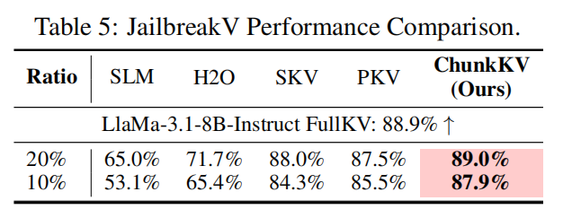 - 主要发现:ChunkKV 在安全/绕过(jailbreak)评测中也表现优越,说明 chunk 保留能更好地维护 prompt 的对齐/安全相关上下文(Table 5)。在 10%/20% 比例下均优于多数 token-level 方法。
