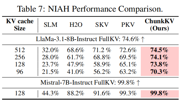 - NIAH 在 LLaMA-3-8B 中,当 KV size = 128 时,ChunkKV 能在更深的 depth% 与更长 token limit 上成功检索到“needle”(Figure 3 的热力图、Table 7 的具体数值)。例如在某些配置下 ChunkKV 的准确率为 73.8%(远超 SnapKV / H2O)。