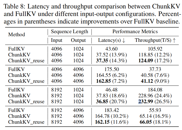 - 在 A40 GPU 上,以 FlashAttention2 进行推理,论文报告了多个 input/output 配置(4096→1024, 4096→4096, 8192→1024, 8192→4096)。ChunkKV 与 ChunkKV_reuse(复用索引)相较 FullKV 在 latency 与 throughput 上均有显著提升,最长输入场景下 ChunkKV_reuse 可达 20.7% latency 减少 与 26.5% throughput 提升(见 Table 8)。