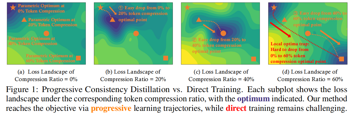 核心思想是: 通过渐进学习(progressive learning)和一致性蒸馏(consistency distillation),让模型从“低压缩、易学习”的状态逐步适应“高压缩、难优化”的场景,从而实现平滑过渡。