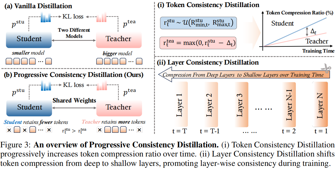 Token Consistency Distillation (TCD): 从 token 维度进行渐进蒸馏。 在训练初期,teacher 与 student 使用较低压缩率;随着训练推进,压缩率逐步提高。teacher 始终比 student 稍微“容易”一些,从而提供稳定的蒸馏指导。