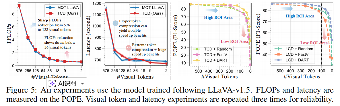 论文指出,虽然极端压缩(1 ~ 2 token)可进一步降低计算量,但性能下降剧烈,且 GPU 延迟收益有限。最佳权衡点通常在 64 ~128 tokens 区间,兼顾性能与速度。
