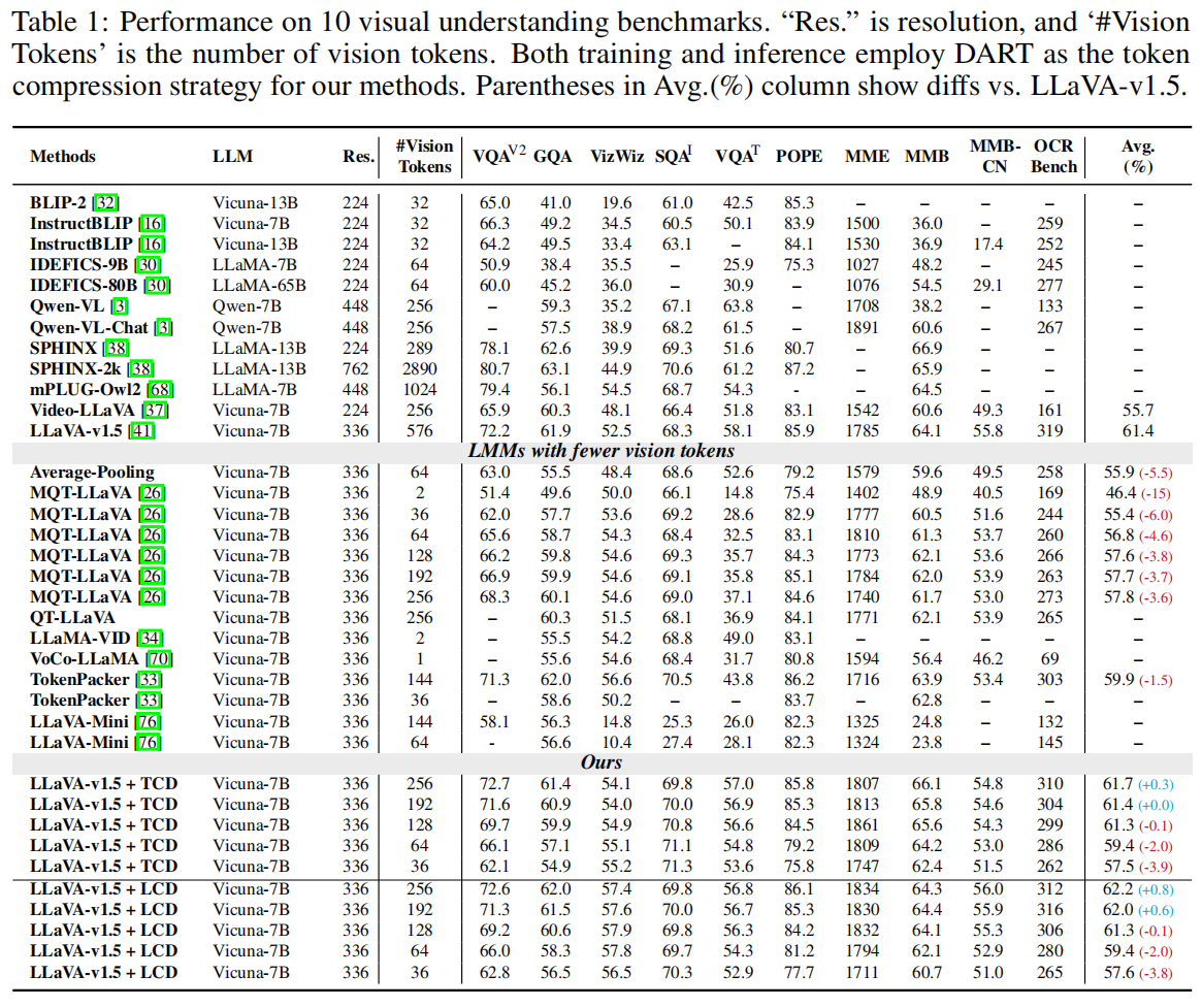 当保留 128 个视觉 token 时,EPIC 模型的性能与原始 LLaVA-v1.5-7B 几乎持平;当 token 数为 192 以上时甚至超越原始模型。这表明视觉 token 中存在大量冗余,压缩并不会显著损害性能。