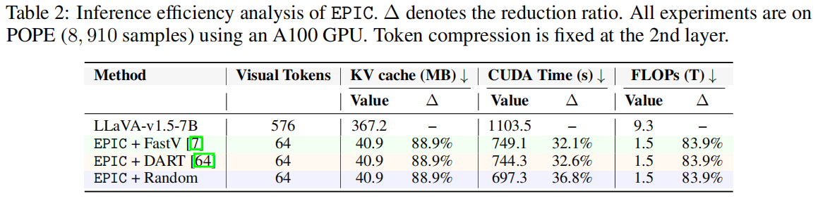 统一框架与兼容性: EPIC 不需要修改模型结构,也不依赖特定的 token 压缩算法,可与 DART、FastV、Random 等方法兼容。