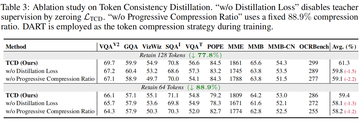 TCD 从 token 维度 逐步增加压缩比,实现模型对视觉 token 压缩的渐进适应。