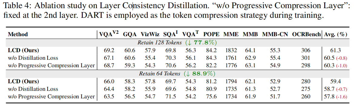 Layer Consistency Distillation (LCD): 从层级维度进行渐进蒸馏。 视觉 token 在模型深层的贡献较小,因此训练初期在深层执行压缩影响较小,随后逐渐将压缩迁移到浅层,实现“由易到难”的层级学习。
