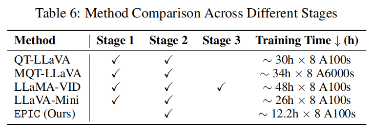 训练阶段: 由于 EPIC 不修改模型结构,只需一次监督微调(Supervised Fine-tuning),在 8×A100 上训练约 12 小时。 而如 MQT-LLaVA、TokenPacker 等架构改造型方法需 30~48 小时。