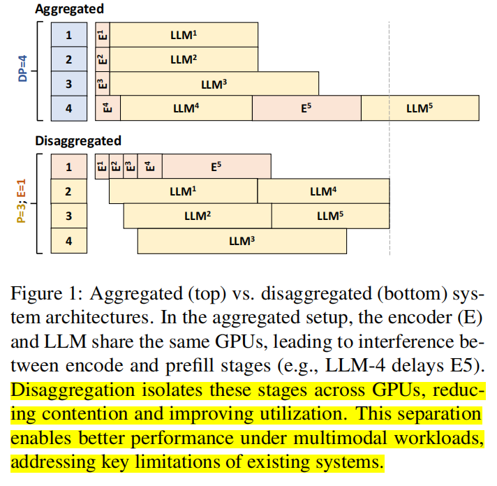 - DistServe:PD disaggregation(prefill-decode 分离),但 E 与 P 聚合在同一组 GPU(论文对其做了扩展以支持 multimodal)。