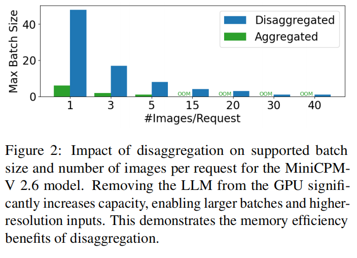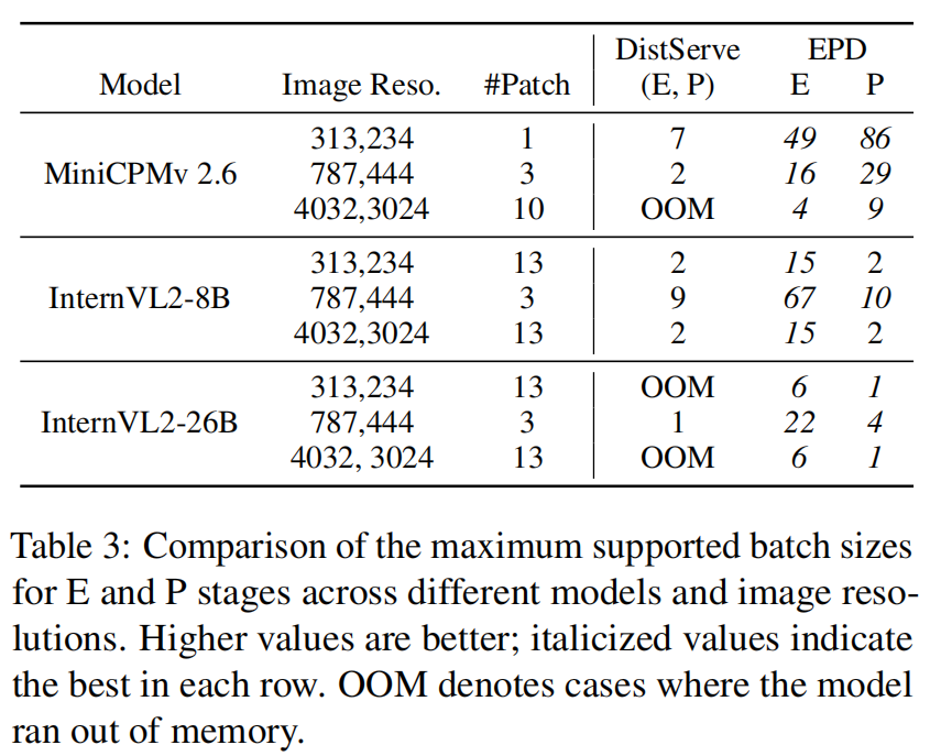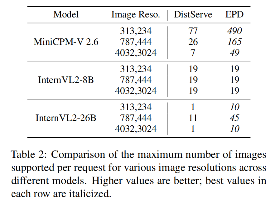 - 例如,在 4032×3024 分辨率下,InternVL2-26B 对比 DistServe,EPD 支持的 images/req 增长 7×(表中列举)。