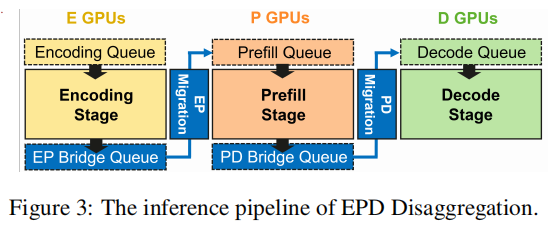 EPD 把推理流程明确划分为三个独立阶段:Encoding (E)、Prefill (P)、Decode (D),并定义两类跨阶段迁移(migration)函数: