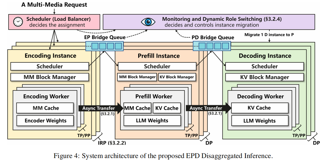 总体架构(见 Figure 4):每个 stage 运行若干 instance(数据并行 DP),每个 instance 含 scheduler、block manager(缓存管理)、多个 worker(可内部做 TP/PP)。E workers 只加载 encoder 权重并维护 MM-cache;P workers 加载 LLM 权重并维护 MM + KV 缓存;D workers 仅加载 LLM 权重并维护 KV 缓存。实例之间以队列和异步传输进行耦合。
