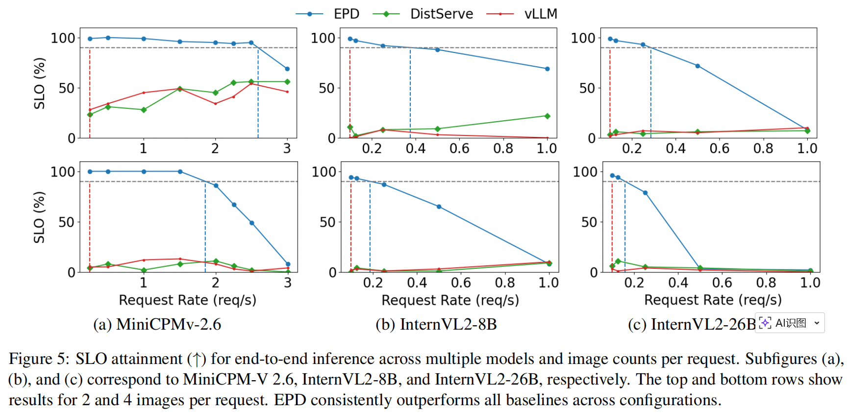 图表:Figure 5 展示不同模型与不同 images-per-request 的 SLO attainment 曲线(EPD 恒优)。