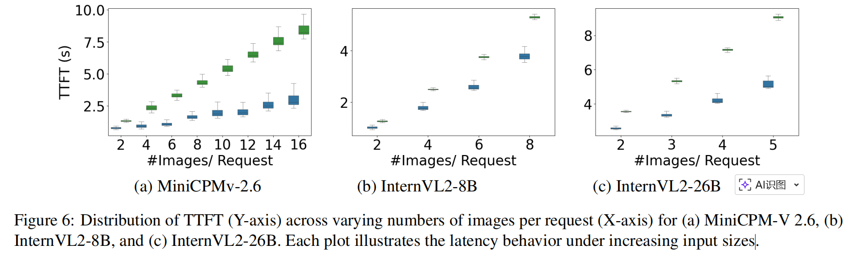 - 分析 TTFT 分布(boxplot),比较 EPD 与 baselines(vLLM/DistServe),不同模型、不同 image counts。