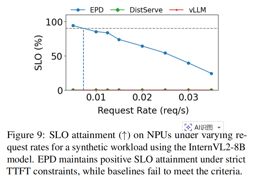 - 在 InternVL2-8B 的 NPU 实验(8 × 4K images/request,最佳配置 5E2P1D)中,EPD 是唯一能满足 SLO(TTFT ≤ 8.5s, TPOT ≤ 0.12s)的方案,vLLM/DistServe 均无法达成。