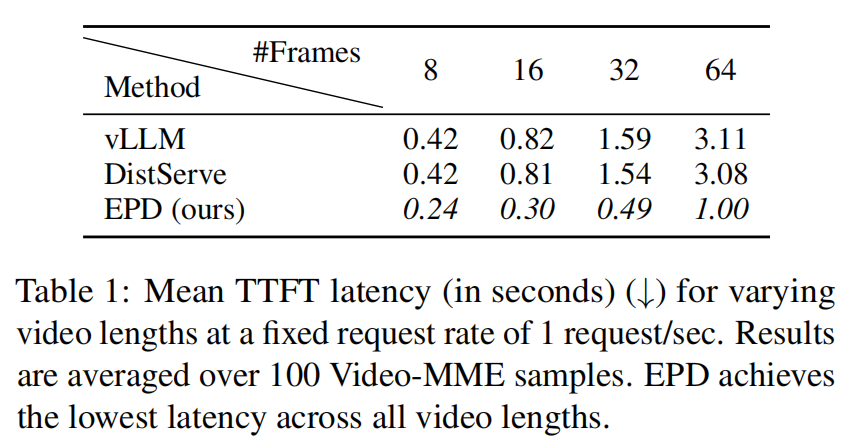 - IRP 极大降低 TTFT:相对 DistServe,EPD 在 MiniCPM-V 上可降低 TTFT 约 71.9%,在 InternVL2-26B 上 44.9%。视频任务(Video-MME)上 Table 1 给出不同帧数下的 mean TTFT(EPD 明显更低,且随着帧数增长,差距放大)。