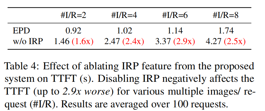 - Effect of IRP(Table 4):关闭 IRP 导致 TTFT 增加 1.6×–2.9×(随图片数增加作用更强)。说明 IRP 对于多图请求/长视频场景是关键。
