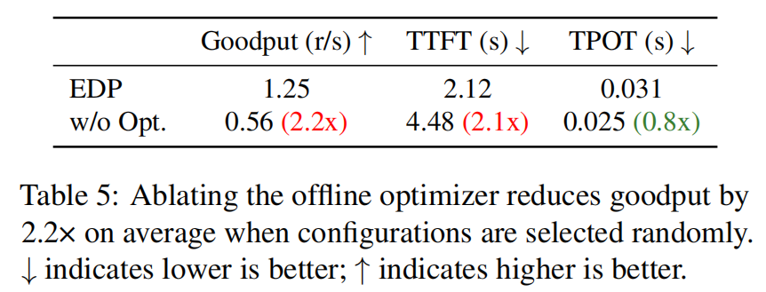 - Effect of Offline Optimizer(Table 5):若随机选择配置代替优化器,goodput 平均下降 2.2×,TTFT 变差约 2.1×,说明黑箱优化器在配置选择上很重要(论文用贝叶斯优化 + 模拟器加速搜索)。