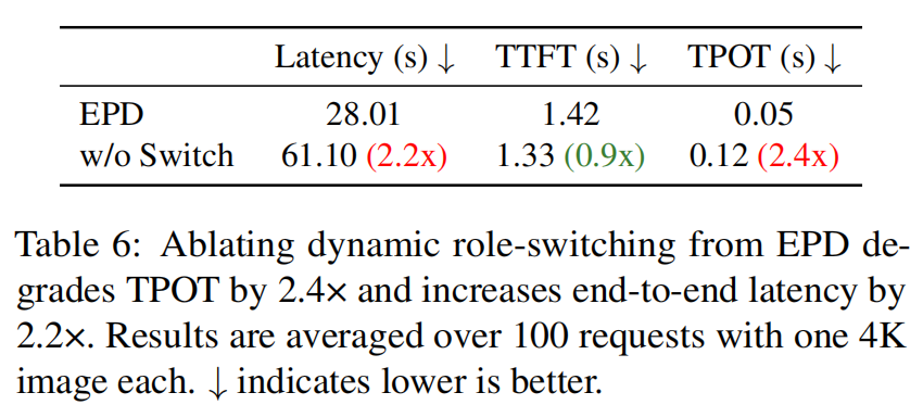 - Effect of Dynamic Role Switching(Table 6):在工作负载突变的场景下(前 10 请求 50 tokens,后 90 请求 500 tokens),若禁用 dynamic switch,总体延迟与 TPOT 均显著恶化(end-to-end latency 从 28.01s → 61.10s,TPOT 从 0.05 → 0.12,表中给出具体倍数)。说明动态迁移对于在线系统稳定性至关重要。