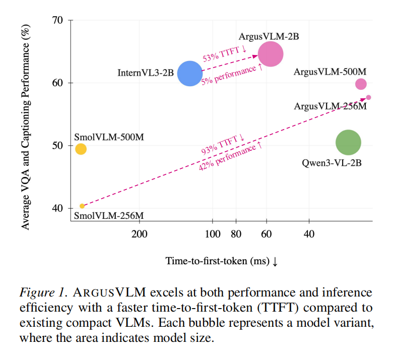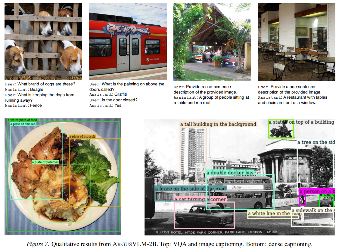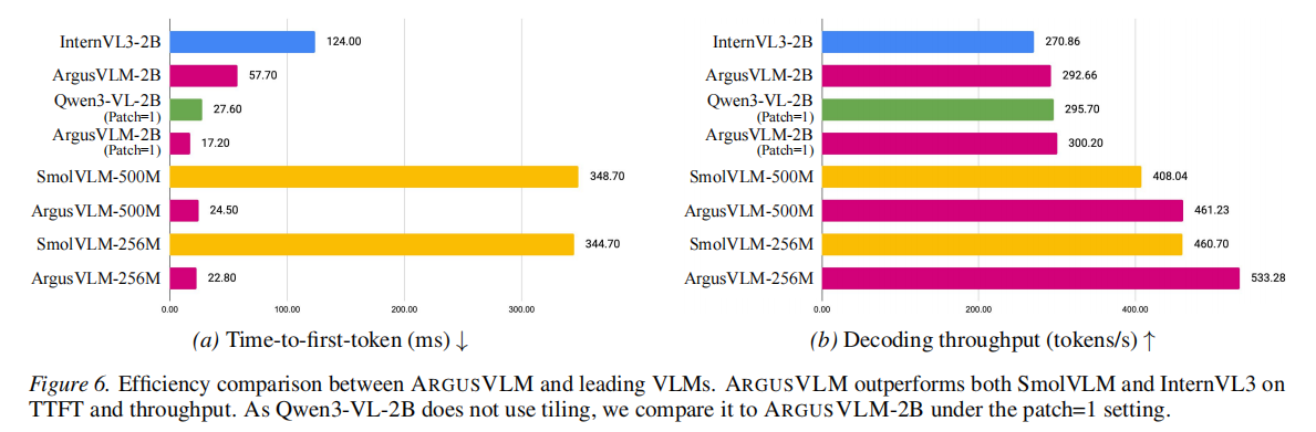 - 卓越性能与效率:ARGUSVLM 在 VQA、图像描述及密集图像描述任务上表现出色,且在延迟和吞吐量上远优达标 (如图 2)。