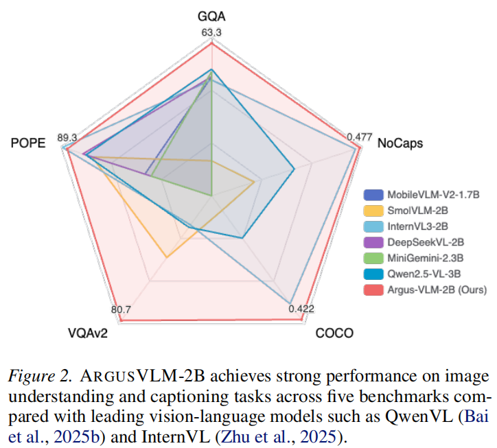 - ARGUSVLM-2B 在多个任务上超越了同尺寸的 InternVL2-2B 和 Qwen2-VL-2B。