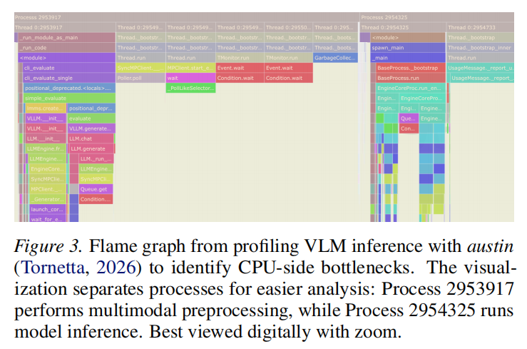 - CPU 操作是主要瓶颈: 由于 GPU 端已经高度优化(FlashAttention, CUDA Graphs),GPU 执行时间已接近饱和。在轻量级模型中,CPU 端的任务(如图像解码、Tokenization)由于无法并行且涉及频繁的 Host-to-Device (H2D) 通信,成为了 TTFT 的核心瓶颈。