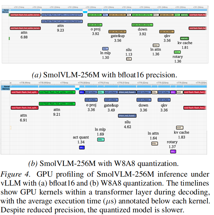 - 原因分析:虽然量化矩阵乘法 (GEMM) 快了 1.1 倍,但激活量化 (Activation Quantization) 引入了显著的额外开销 (+5.50µs),即便已融合进 LayerNorm 或 Silu 内核,该开销仍抵消了计算收益。