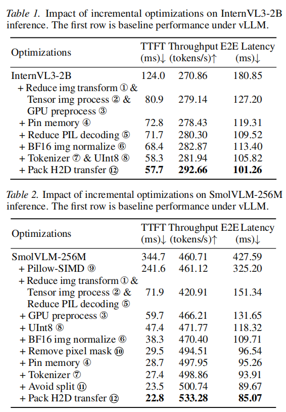 本研究通过针对性的 CPU 端优化,将 InternVL3-2B 的 TTFT 从 124.0 ms 降至 57.7 ms,将 SmolVLM-256M 的 TTFT 从 344.7 ms 降至 22.8 ms (如图 1 所示)。