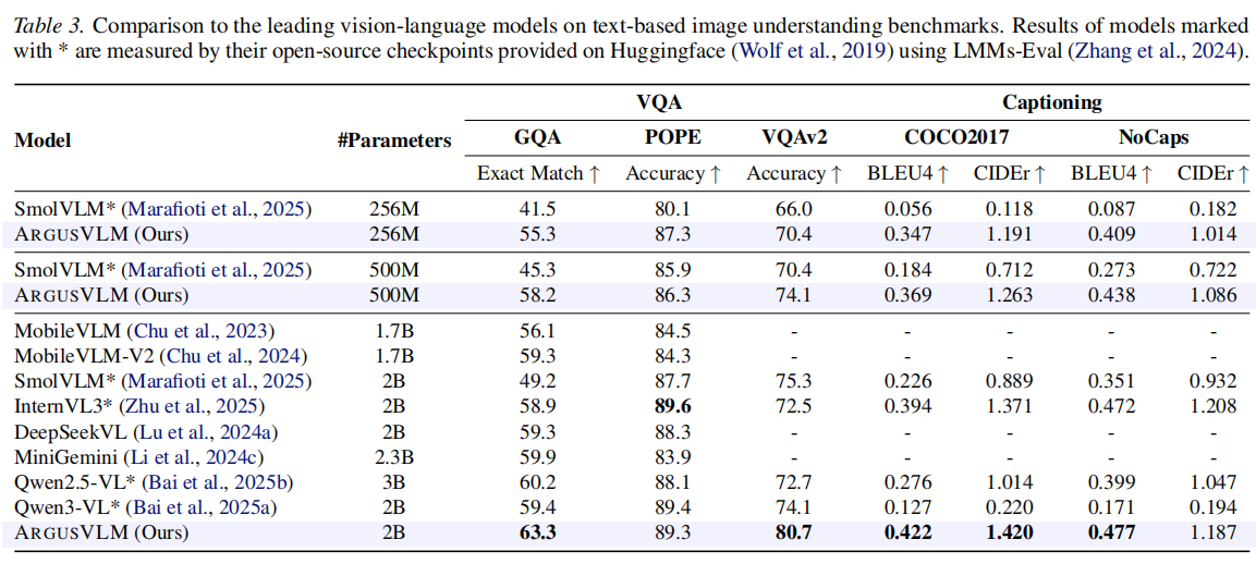 - ARGUSVLM-256M 尽管参数量极小,但在文本识别和基础推理任务上展现了极高的效率比。